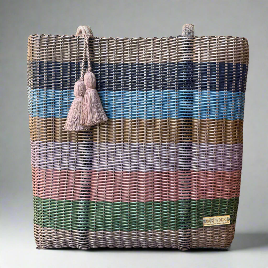 The multicolor striped bags are fun and colorful and perfect at the beach, the market, as a carry-on, for the office, the gym, basically anywhere that you'd like an attractive and sturdy carry-all bag. They are very durable and easy to wipe down/clean and they are 100% vegan. The fall version was featured in the June 2021 issue of HGTV! Feliz was our new cesta design of 2021; Mucho was early 2022 & our new summer bag in 2022 (available by special order only) was LA PLAYA! In 2023 we introduced our rainbow design 'arco iris' & our more subtle design 'WHIMSY!', which is a veritable landscape of color. In 2024 we've added 'Nuevo24', a tribute to Pantone's Color of the Year 'Peach Fuzz' & la Tormenta, which only had a brief run until we're able to source the right colors again.